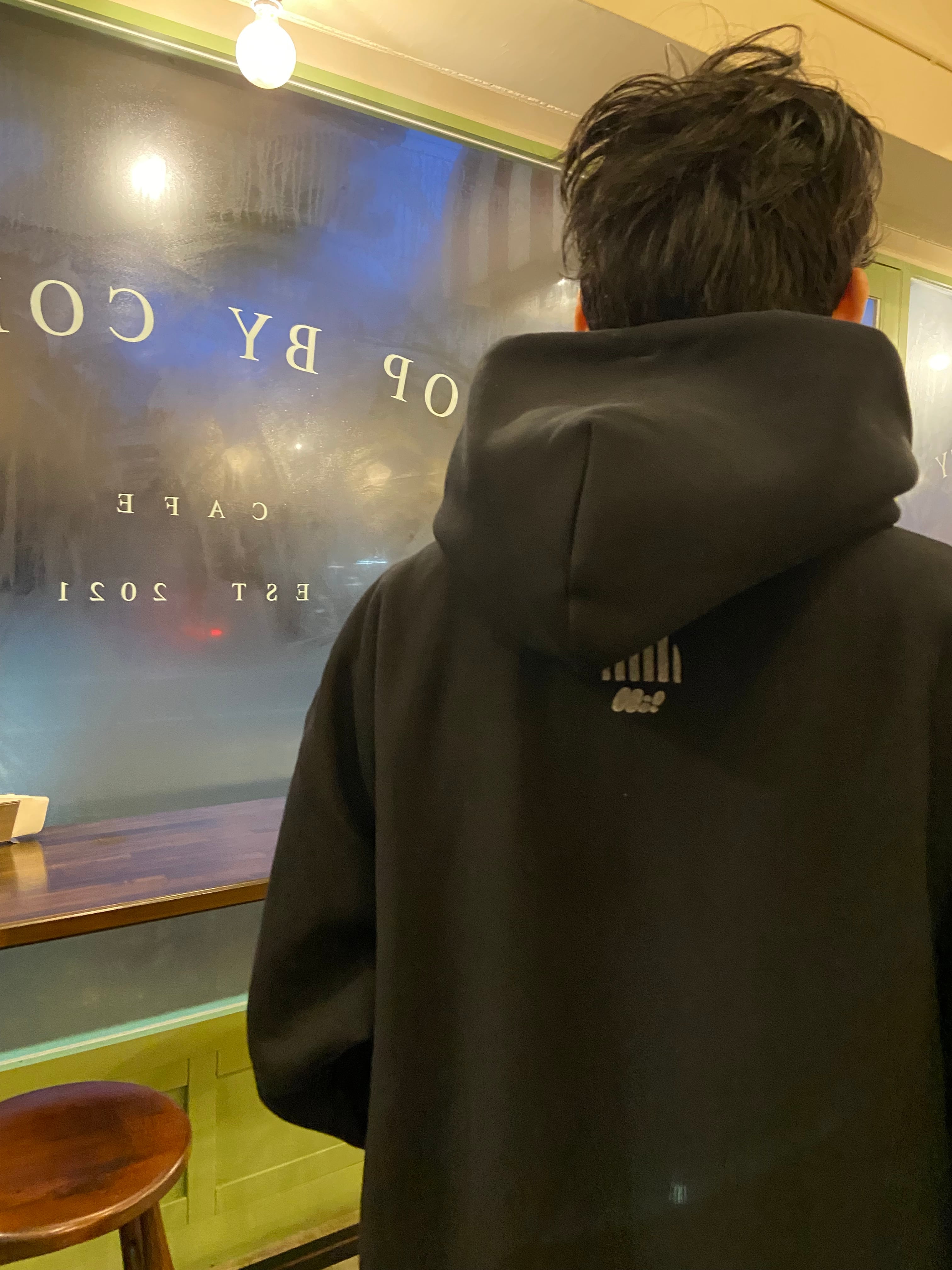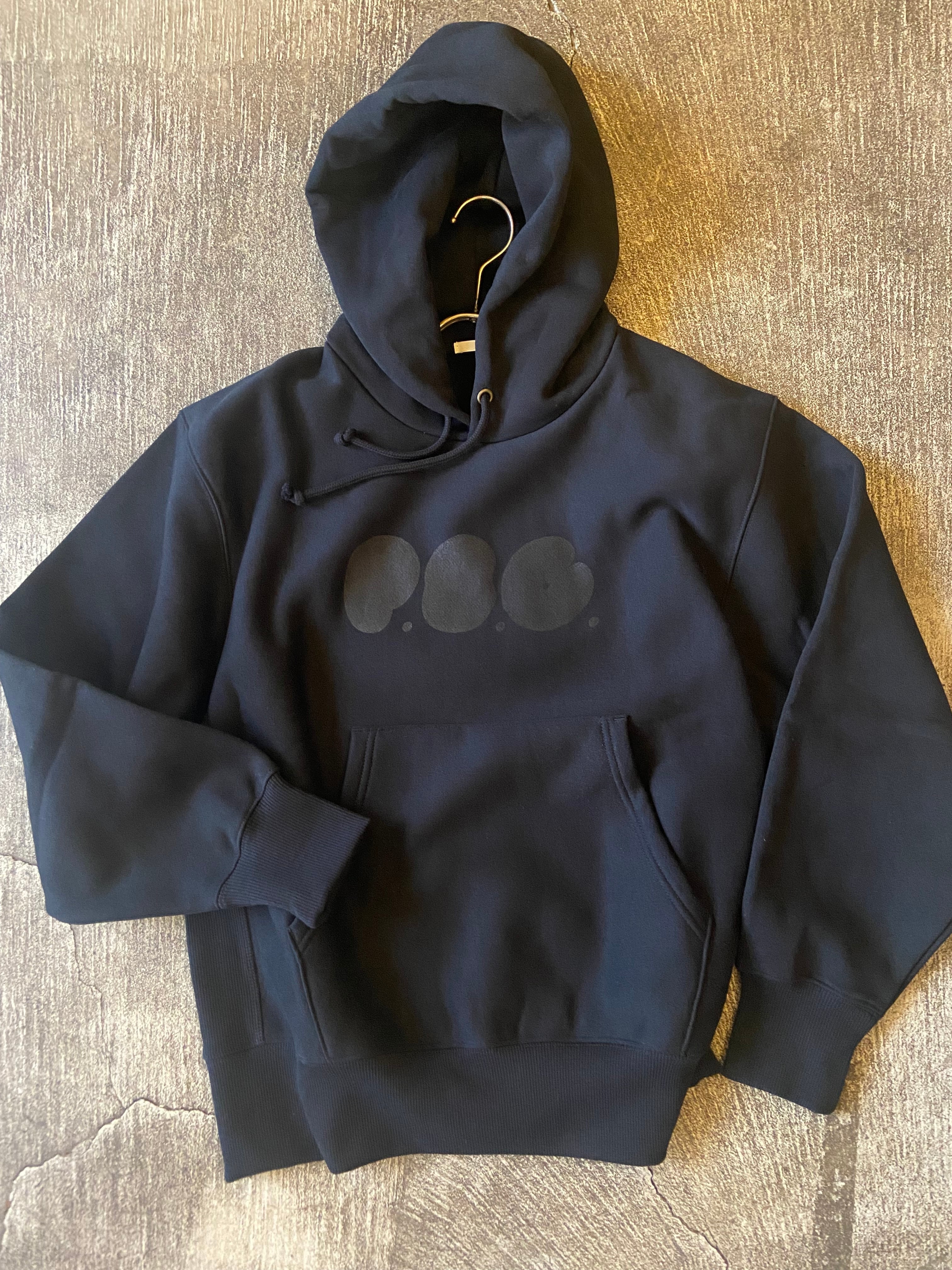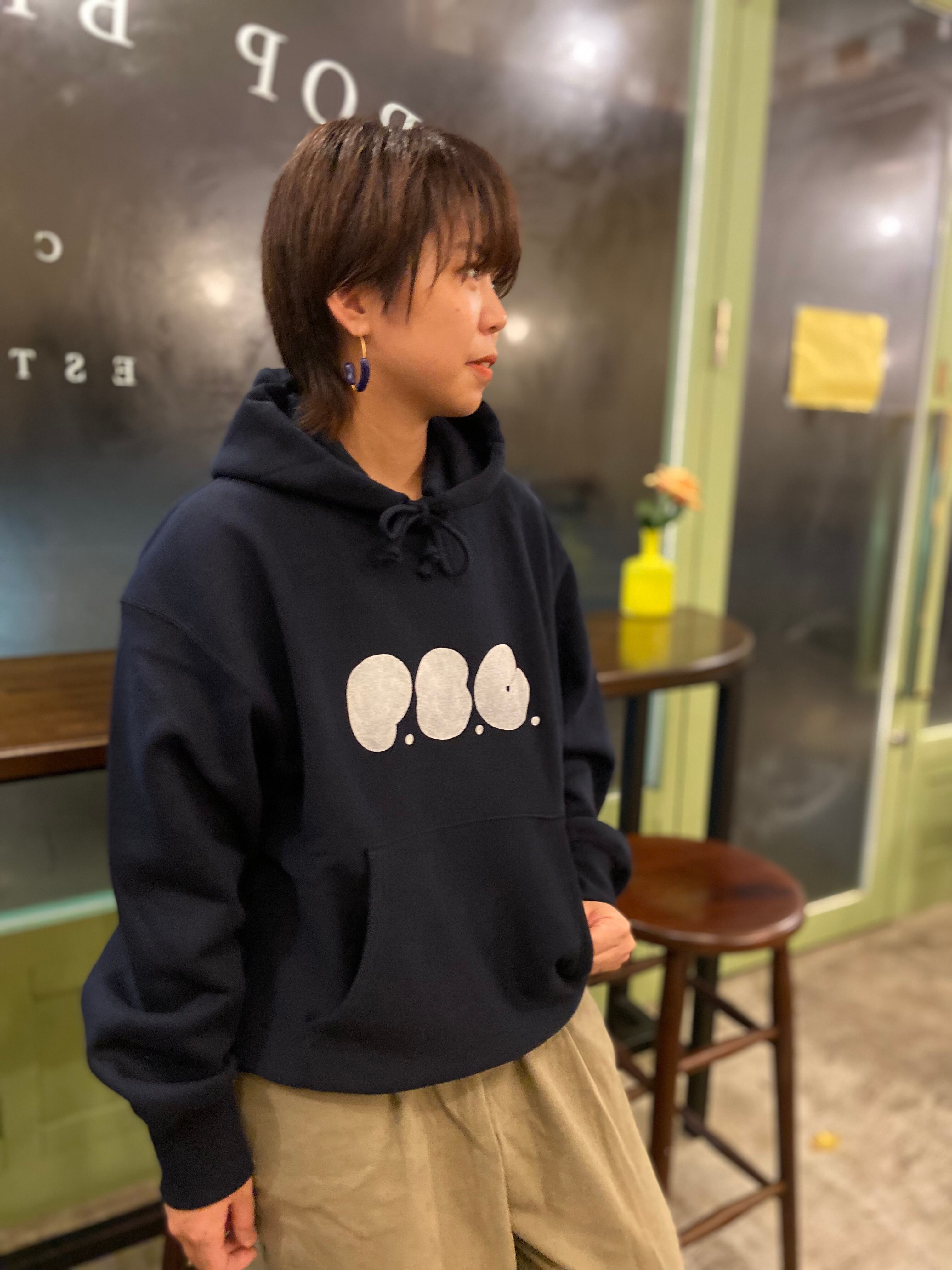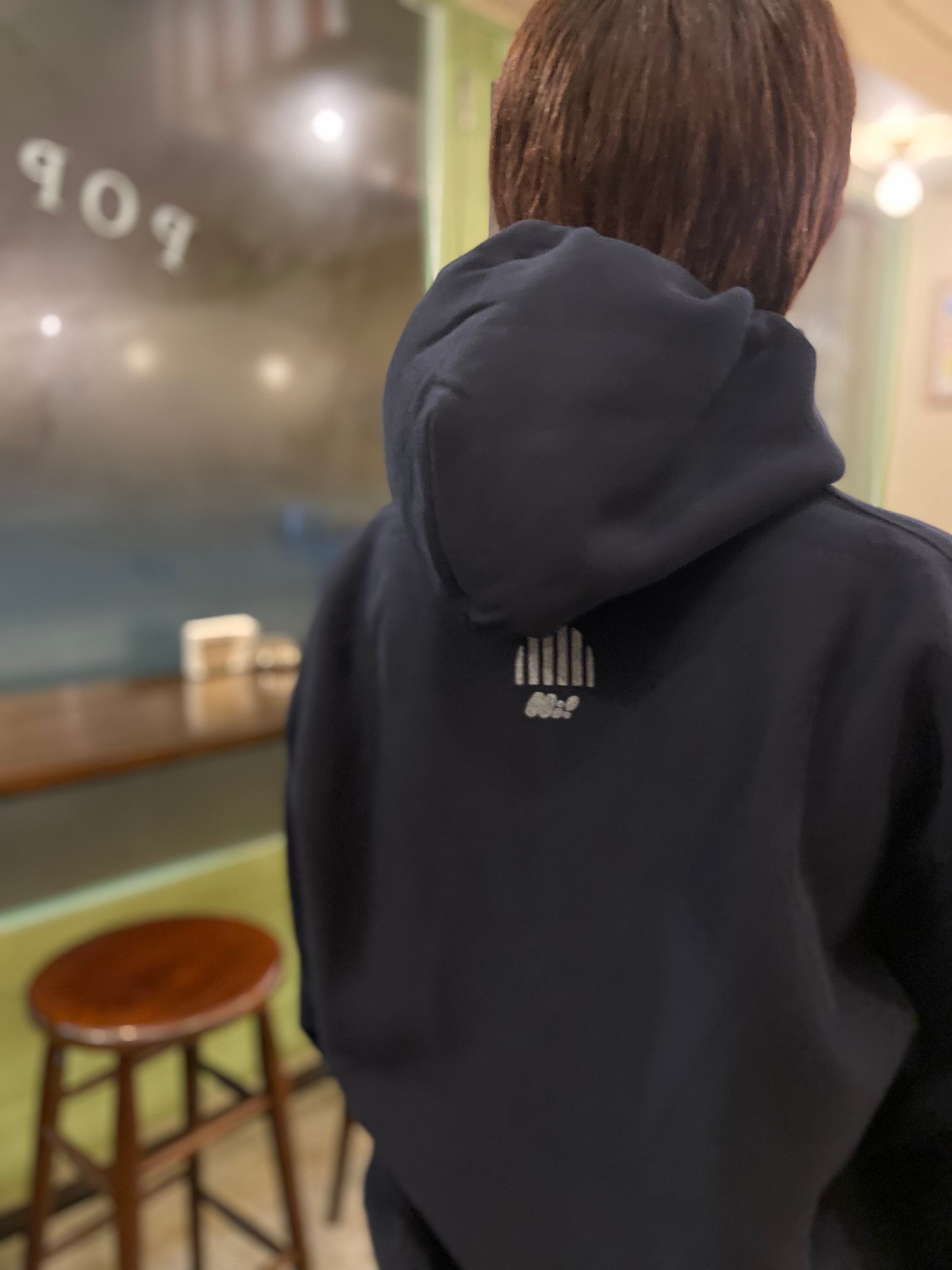 絵本作家の『のふらもら」さんにデザインしていただいたP.B.Cロゴをフロント部分に。バックは外観の象徴でもあるオーニングのデザインをパーカ部分から見え隠れする箇所にプリントしたアイテム。