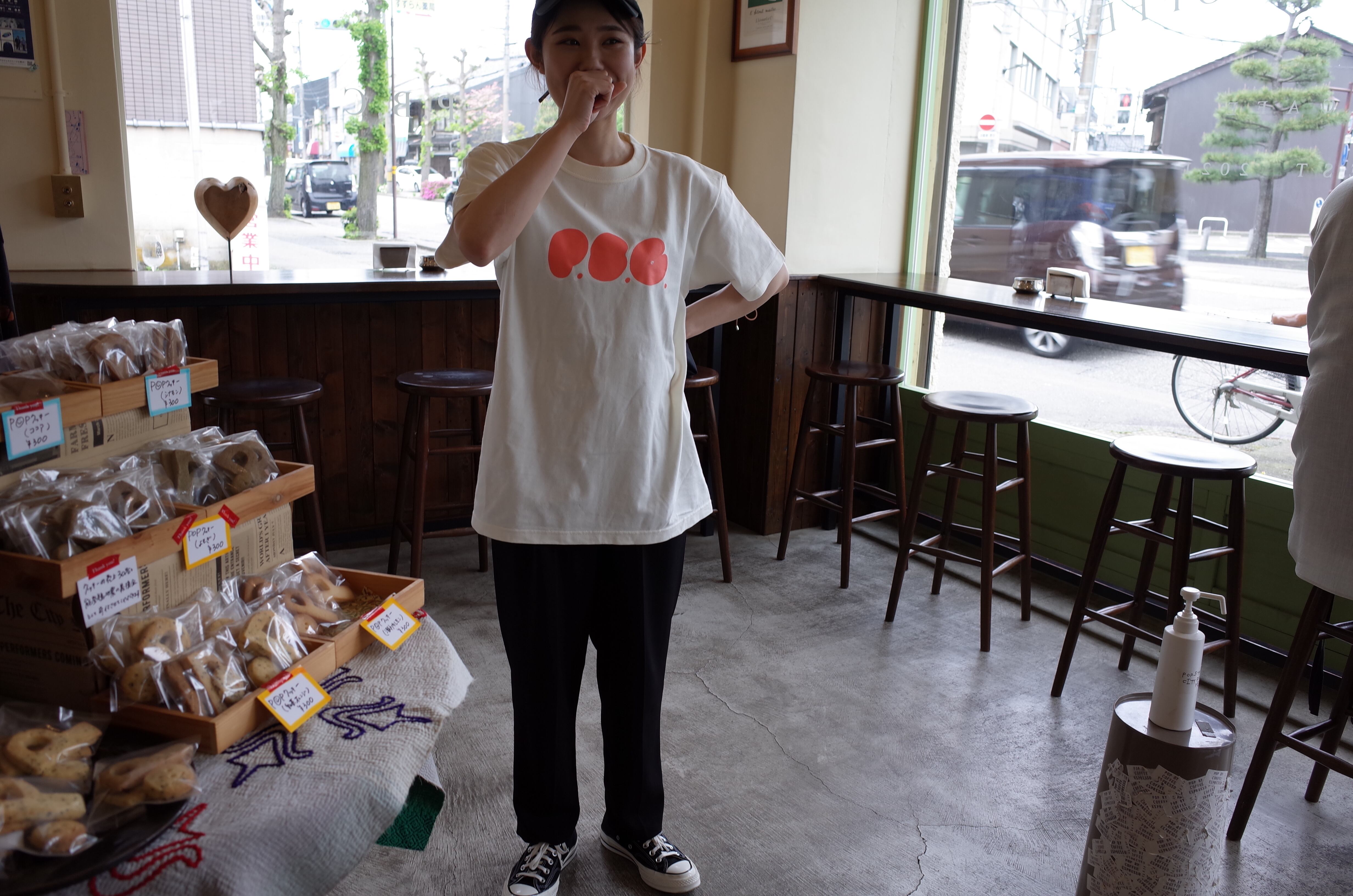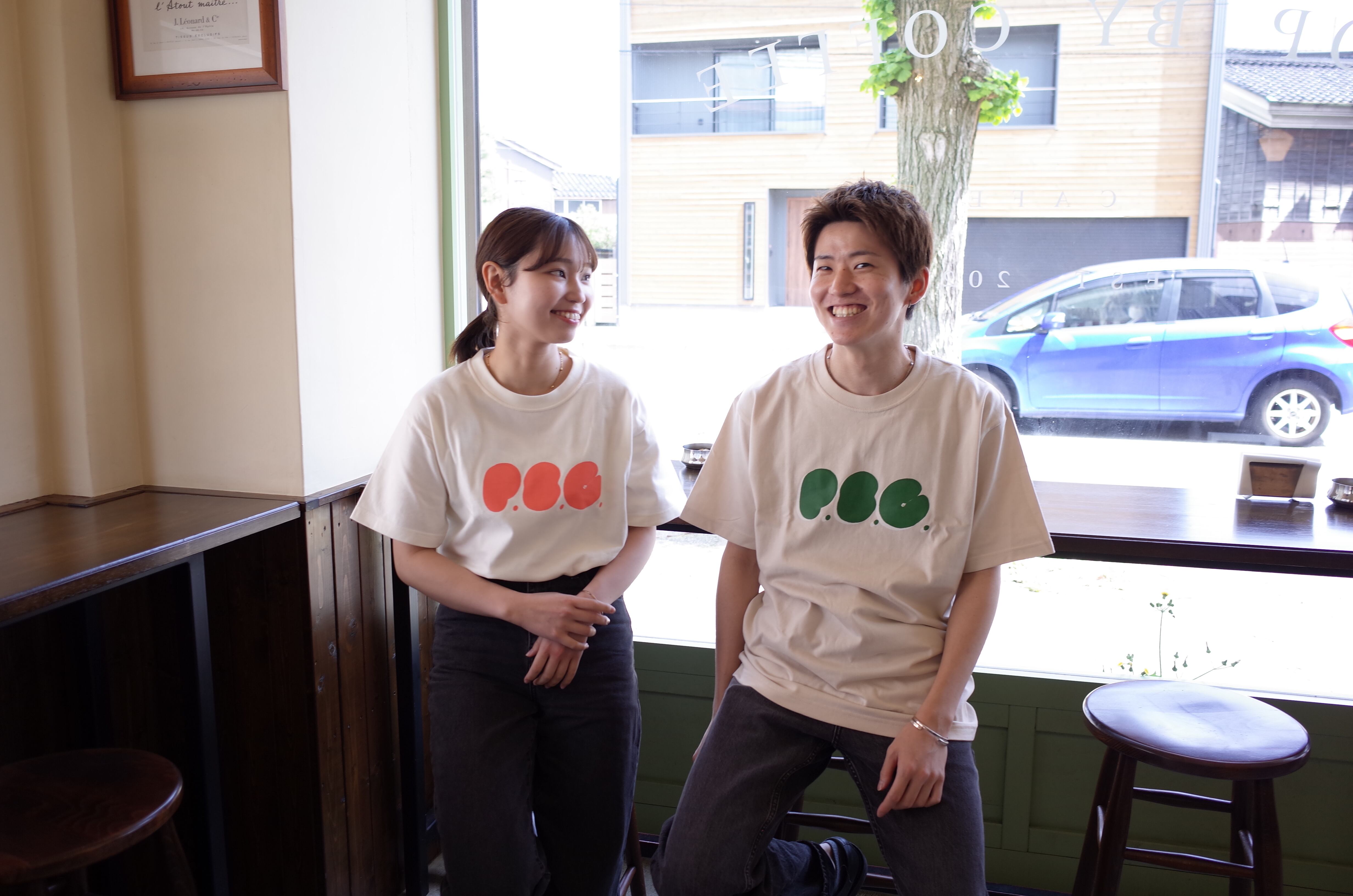絵本作家の『のふらもら」さんにデザインしていただいたP.B.Cロゴをフロント部分に。バックは外観の象徴でもあるオーニングのデザインをプリントしたアイテム。